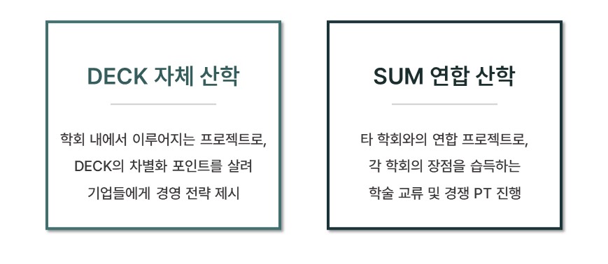 학회원들은 연합 산학을 통해 타 학회와 학술 교류를 경험하고, 경쟁 PT 형식의 산학협력 프로젝트를 진행하며, 사고의 확장과 경영 실무를 경험할 수 있습니다. DECK는 체계적인 세션을 통해 함양한 DECKian만의 현실적이고 독창적인 전략을 통해, 매해 SUM 연합 산학에서 우수한 성과를 거두고 있습니다.
