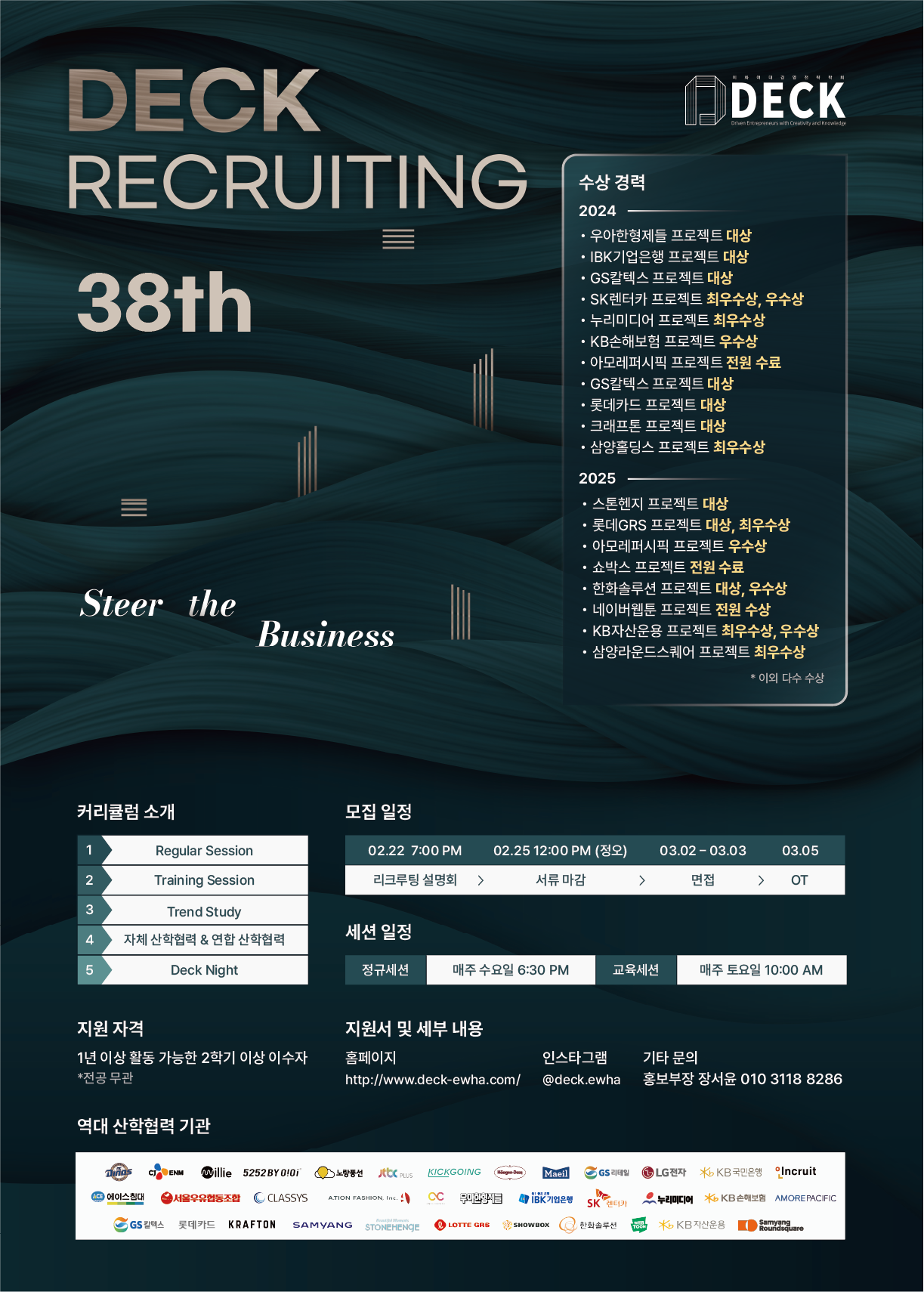 기타문의 : 회장 이다원 (010-9576-1180) / 홍보부장 장서윤 (010-3118-8286) / DECK 카카오톡 채널 'deck_ewha'